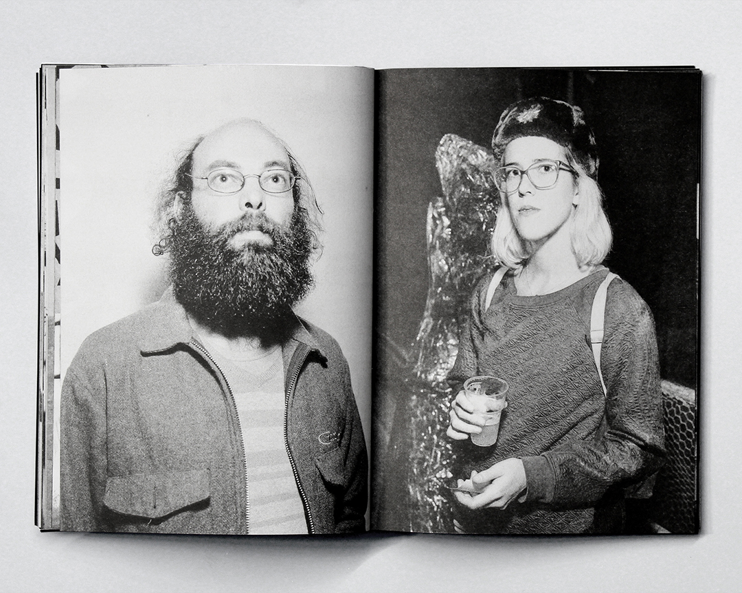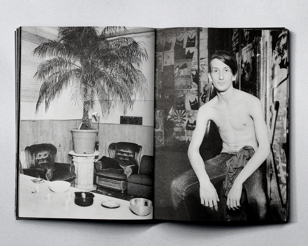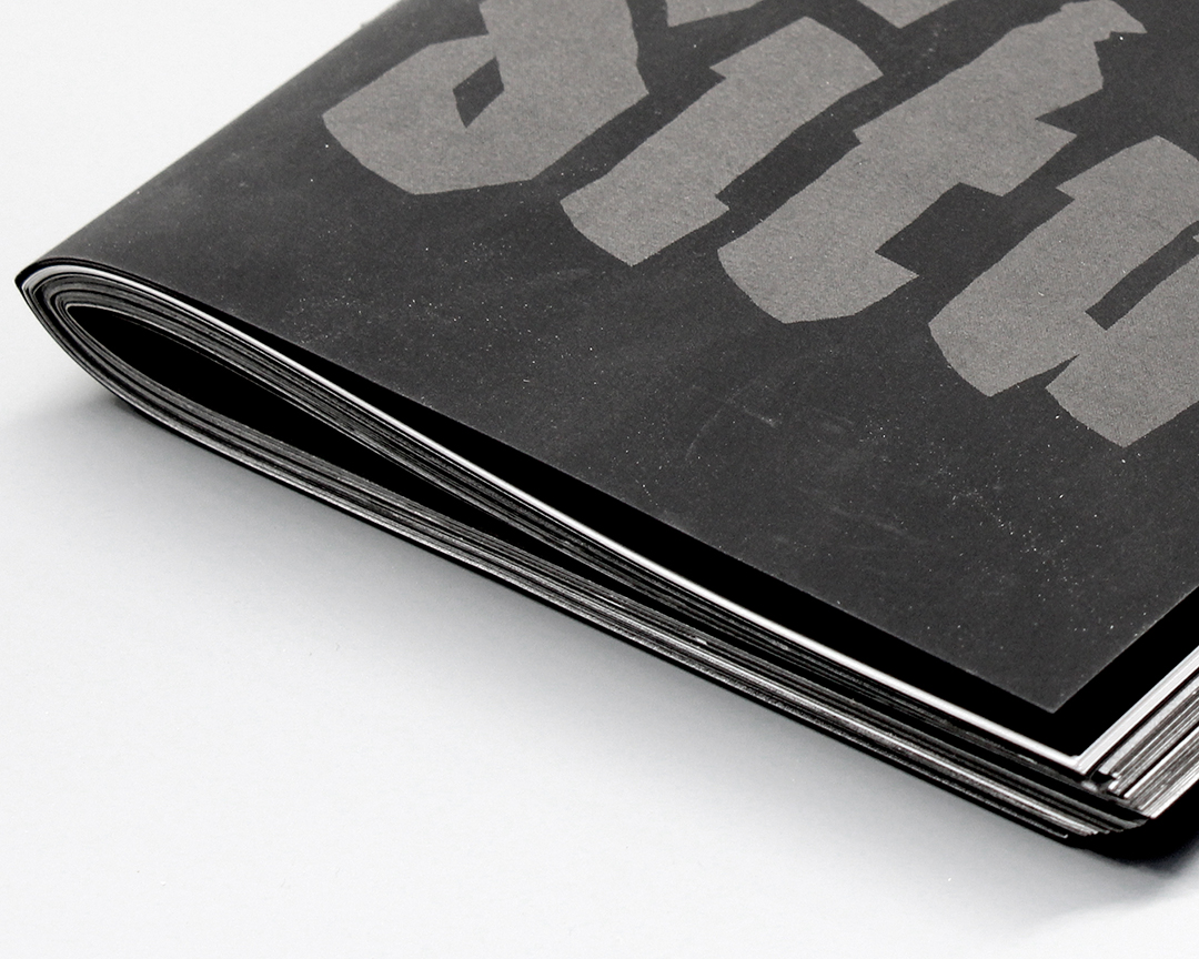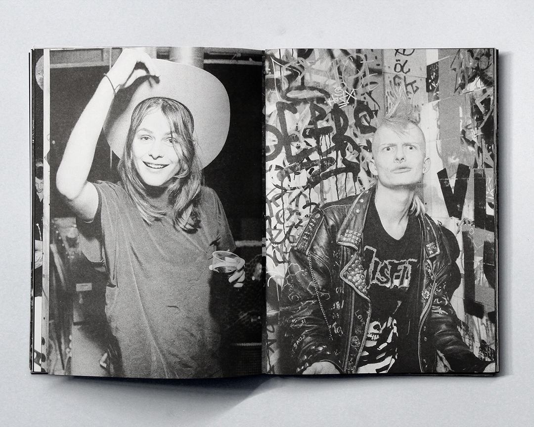 The book is bound with a cahier stitch, folded and left uncut, as a reference to DIY risograph and photocopied punk and underground zines.