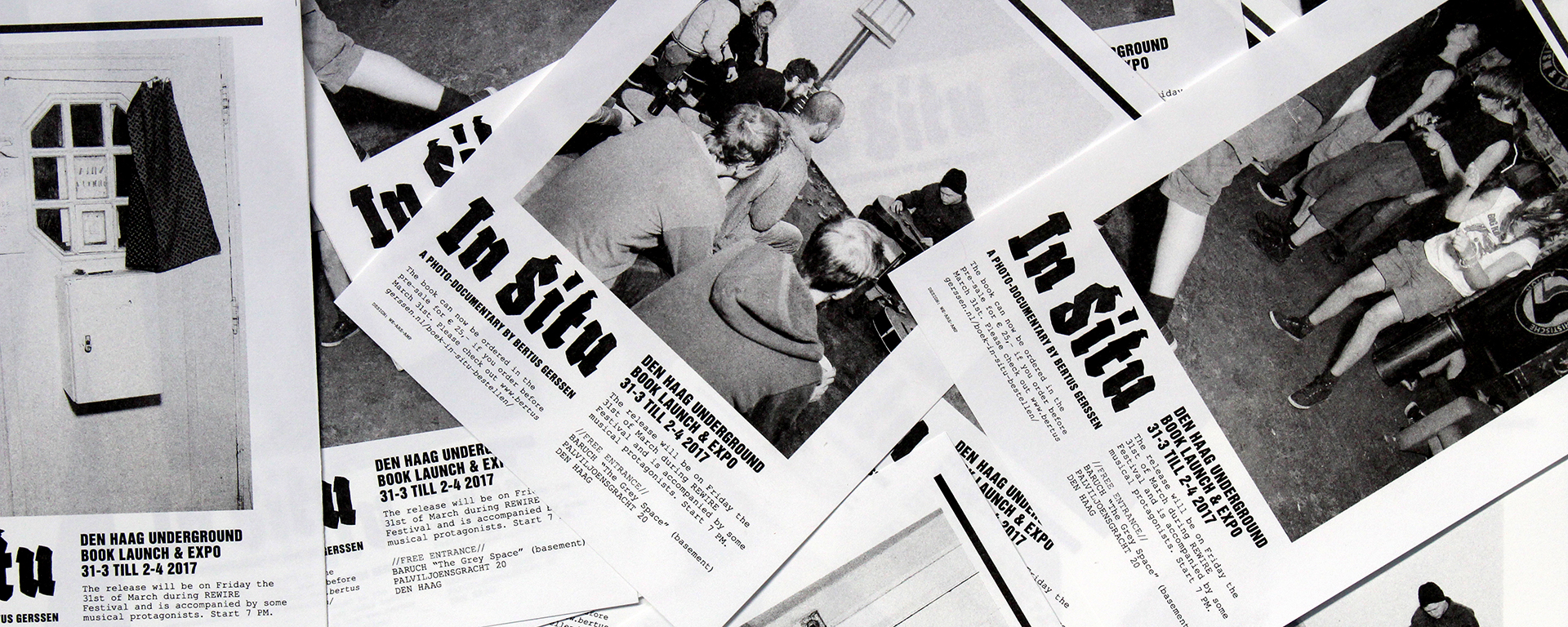 IN SITU is a 180-page photo documentary on The Hague's underground music scene by photographer Bertus Gerssen. The book is riso-printed in black and white, and on black and white paper. It features photos from the Hague’s underground music scene from 2013 to 2015 and is an hommage to now mostly defunct DIY stages, squatted art spaces and tough-as-nails artists and crowds.