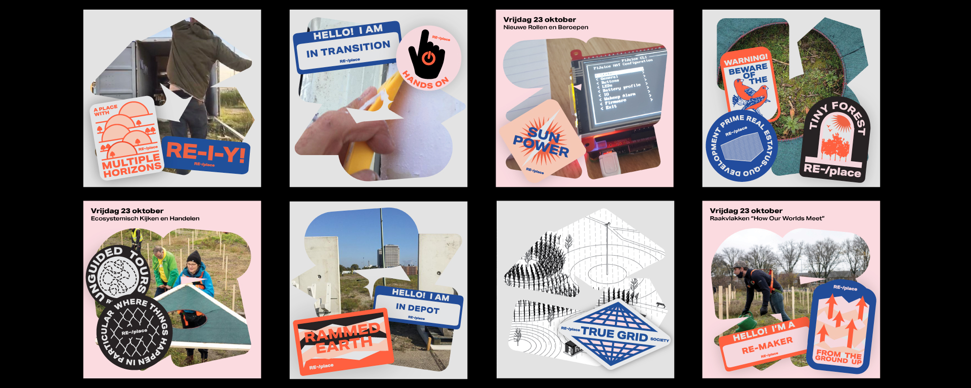 The online identity consists of the same set of stickers, but has one more feature to it; the assembled shapes also work as a container for content (photos and videos) from the RE-/place site itself, translating the offline project to an online equivalent.